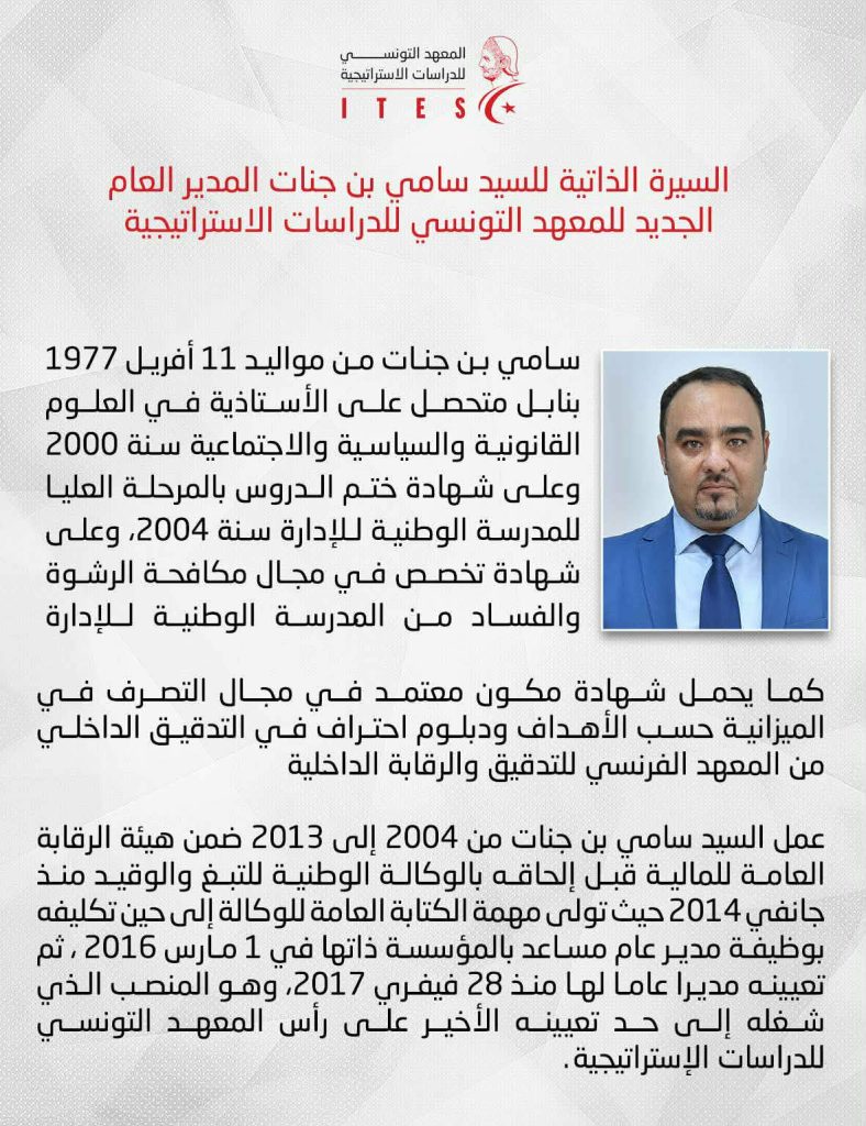 متداول: السيد سامي بن جنات المدير السابق للوكالة الوطنية للتبغ والوقيد مديرا جديدا لمعهد الدراسات الإستراتيجية التابع لرئاسة الجمهورية منذ سنة 2019.