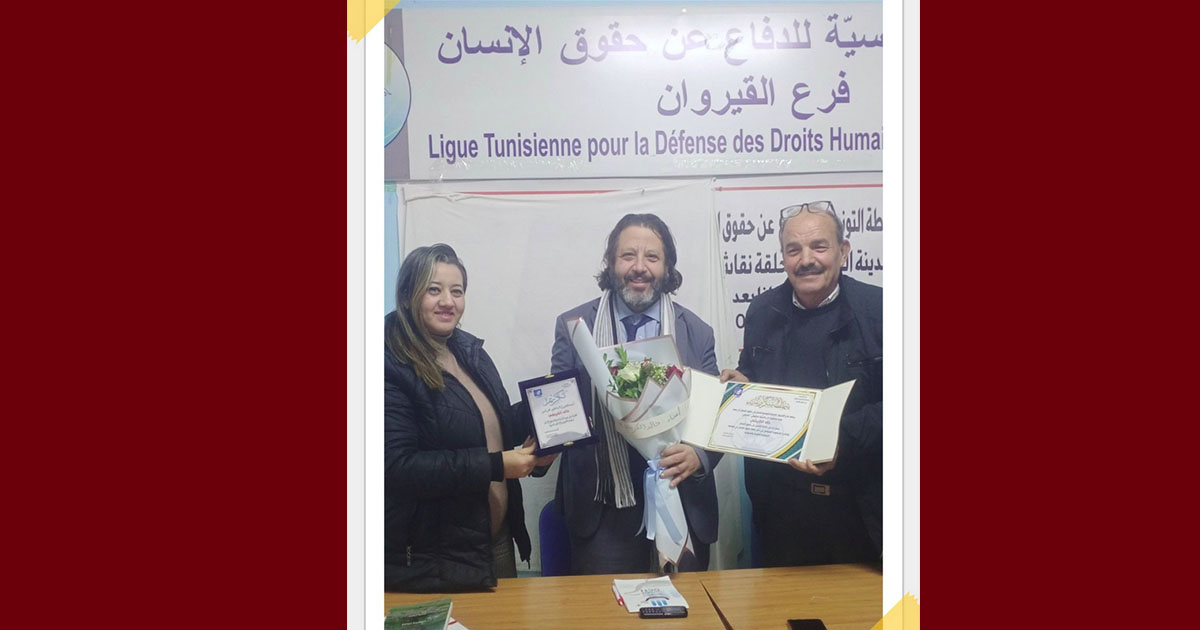 “كلُّ الشكرِ والتقدير لفرع الرابطة التونسية للدفاع عن حقوق الإنسان بالقيروان، في شخصِ رئيسه الأستاذ فوزي المقدّم، على هذا التكريم الذي أعتزّ به وأعدّه وسامَ التزامٍ لا وسامَ مجاملة.