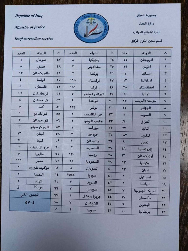كشفت وزارة العدل العراقية اليوم أعداد ارهابيي تنظيم داعش و جنسياتهم من الذين تم تحويلهم من سوريا.