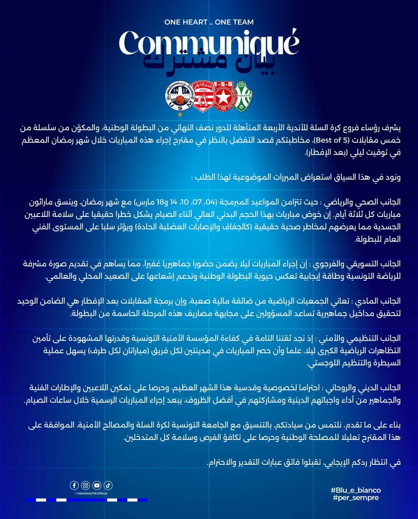 بطولة كرة السلة موجّه إلى السيد وزير الشباب والرياضة بخصوص برمجة مباريات نصف النهائي خلال شهر رمضان المعظم.