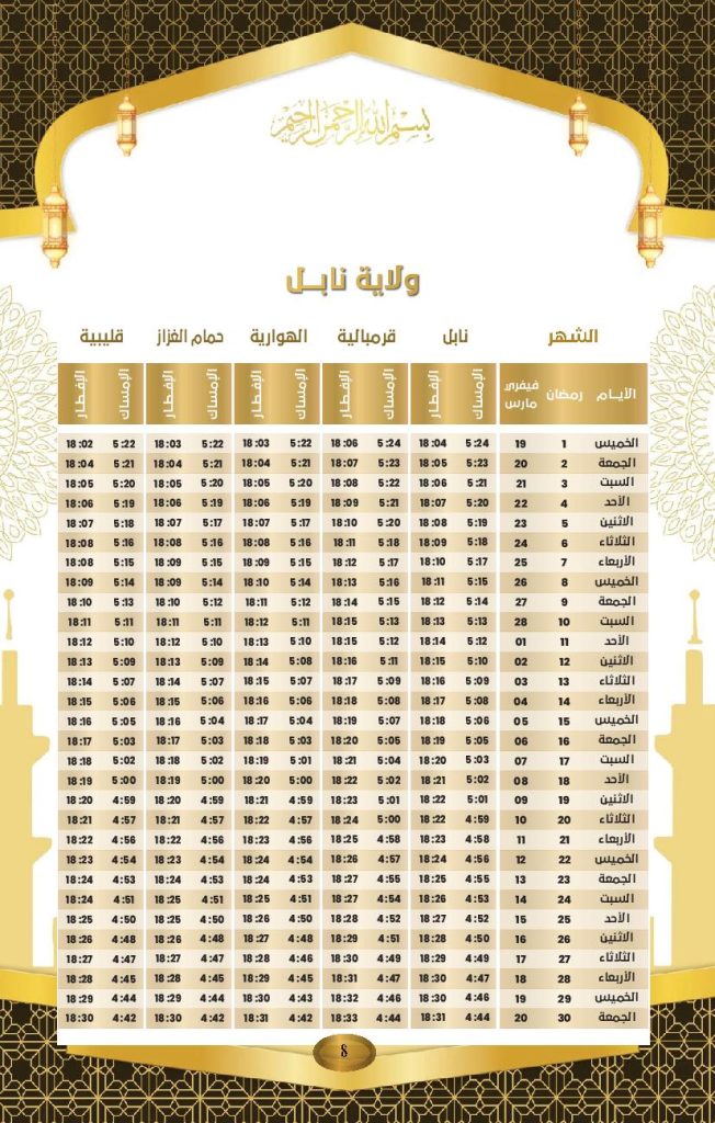 مواعيد الافطار و السحور في ولاية نابل: