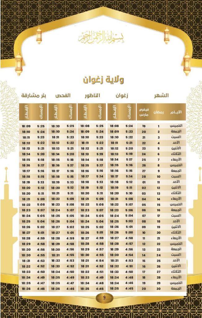مواعيد الافطار و السحور في ولاية زغوان: