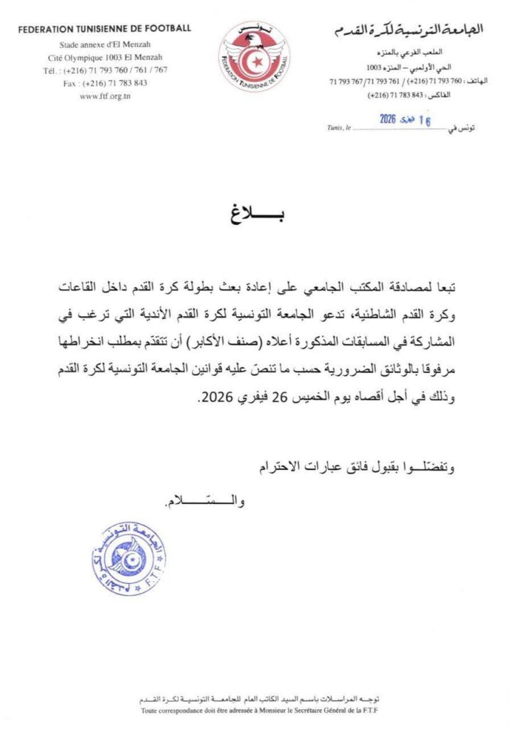 الجامعة التونسية لكرة القدم: تبعا لمصادقة المكتب الجامعي على إعادة بعث بطولة كرة القدم داخل القاعات وكرة القدم الشاطئية، تدعو الجامعة التونسية لكرة القدم الأندية التي ترغب في المشاركة في المسابقات المذكورة أعلاه (صنف الأكابر) أن تتقدّم بمطلب انخراطها مرفوقا بالوثائق الضرورية حسب ما تنصّ عليه قوانين الجامعة التونسية لكرة القدم وذلك في أجل أقصاه يوم الخميس 26 فيفري 2026.