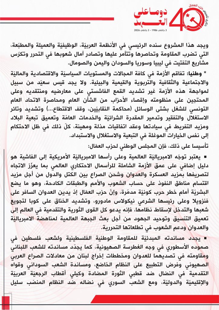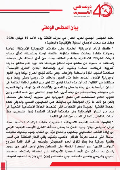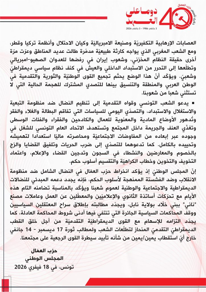انعقد المجلس الوطنيّ لحزب العمال في دورته الثالثة يوم الأحد 15 فيفري 2026، ووقف عند سمات الأوضاع الدولية والإقليمية والوطنية :