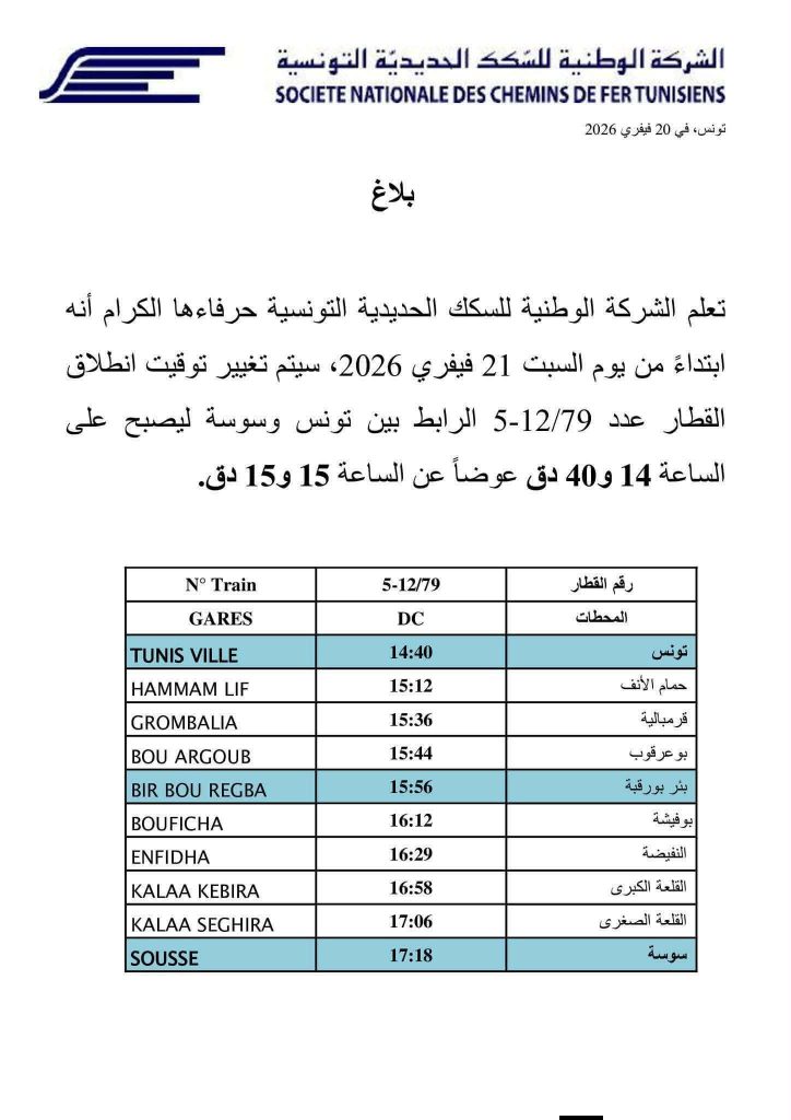 تعلم الشركة الوطنية للسكك الحديدية التونسية حرفاءها أنه ابتداء من يوم غد السبت 21 فيفري 2026، سيتم تغيير توقيت انطلاق القطار عدد 5-12/79 الرابط بيت تونس و سوسة ليصبح على الساعة 14و40 دق عوضا عن الساعة 15-15 دق.