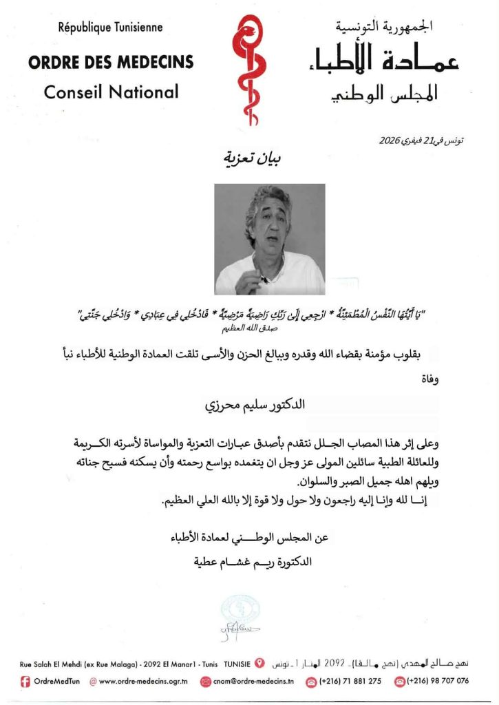 على اثر تلقيه نبأ وفاة الدكتور سليم المحرزي اليوم السبت 21 فيفري 2026، أصدر المجلس الوطني لعمادة الأطباء بلاغ تعزية جاء فيه ما يلي:
