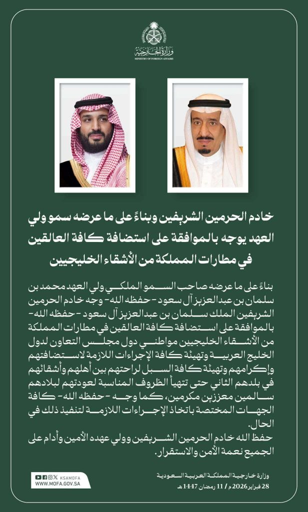 نشرته وزارة الخارجية للمملكة العربية السعودية مساء اليوم السبت 28 فيفري 2026: