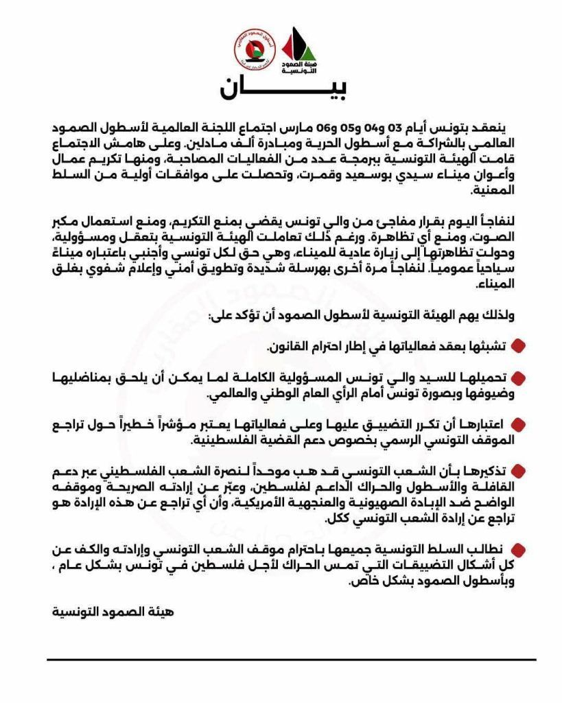- نطالب السلط التونسية جميعها باحترام موقف الشعب التونسي وإرادته والكف عن كل أشكال التضييقات التي تمس الحراك لأجل فلسطين في تونس بشكل عام ، وبأسطول الصمود بشكل خاص”.