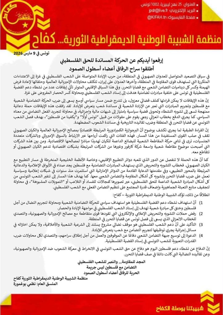 إنّ الدفاع عن نشطاء دعم فلسطين اليوم هو دفاع عن حق الشعب التونسي في الانخراط في معركة الشعوب ضد الإمبريالية والصهيونية، وعن تقاليده النضالية التي كانت دائمًا في صف قضايا التحرر.