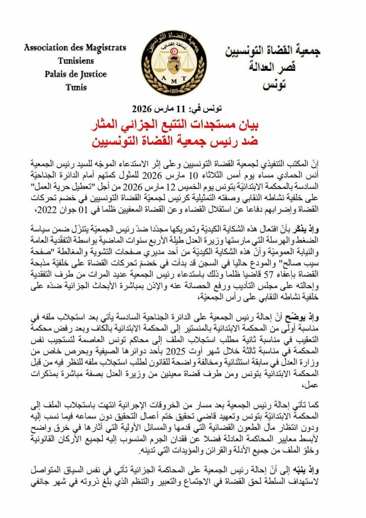 نص البيان/ إنّ المكتب التنفيذي لجمعية القضاة التونسيين وعلى إثر الاستدعاء الموجّه للسيد رئيس الجمعية أنس الحمادي مساء يوم أمس الثلاثاء 10 مارس 2026 للمثول كمتهم أمام الدائرة الجناحيّة السادسة بالمحكمة الابتدائيّة بتونس يوم الخميس 12 مارس 2026 من أجل “تعطيل حرية العمل” على خلفية نشاطه النقابي وصفته التمثيلية كرئيس لجمعيّة القضاة التونسيين في خضم تحركات القضاة وإضرابهم دفاعا عن استقلال القضاء وعن القضاة المعفيين ظلما في 01 جوان 2022،