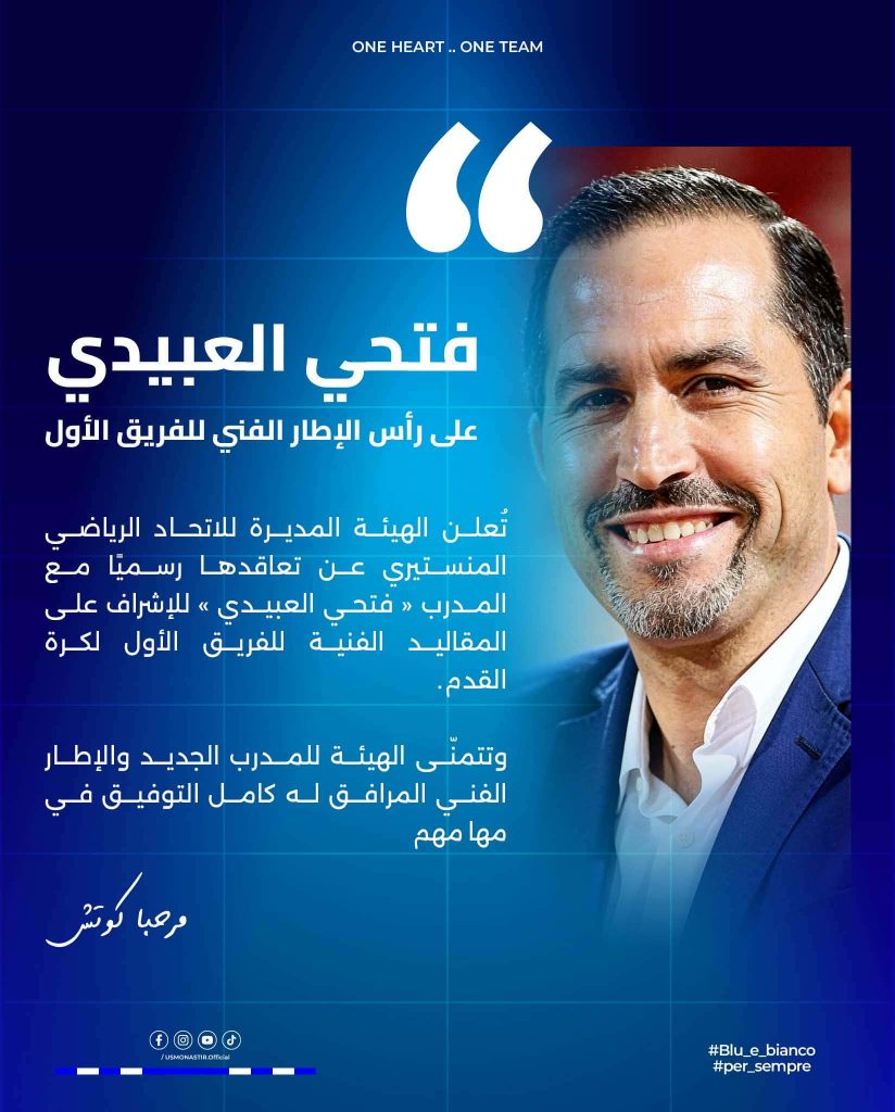 تعلن الهيئة المديرة للاتحاد الرياضي المنستيري اليوم السبت عبر صفحتها الرسمية بالفايسبوك عن تعاقدها رسميا مع المدرب فتحي العبيدي للاشراف على المقاليد الفنية للفريق الاول لكرة القدم.