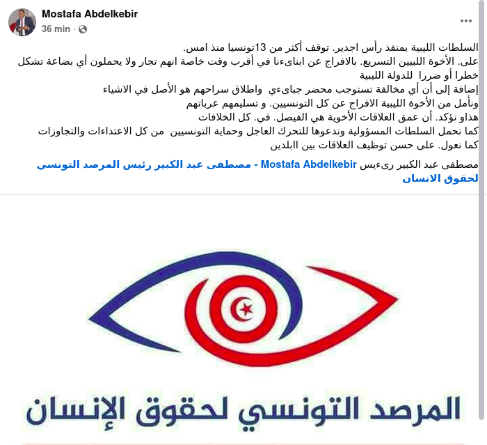 “على الأخوة اللبيين التسريع بالافراج عن ابنائنا في أقرب وقت خاصة انهم تجار ولا يحملون أي بضاعة تشكل خطرا أو ضررا للدولة الليبية، إضافة إلى أن أي مخالفة تستوجب محضر جبائيا واطلاق سراحهم هو الأصل في الاشياء