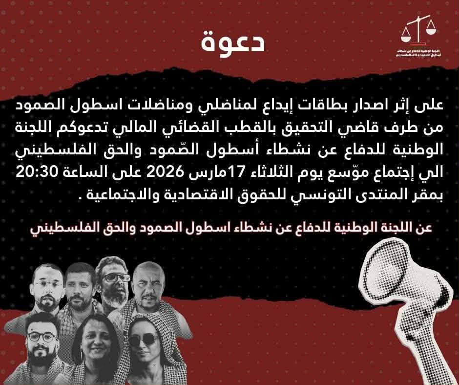 على إثر اصدار بطاقات إيداع لمناضلي ومناضلات اسطول الصمود من طرف قاضي التحقيق بالقطب القضائي المالي تدعوكم اللجنة الوطنية للدفاع عن نشطاء أسطول الصّمود والحق الفلسطيني الي إجتماع موّسع يوم الثلاثاء 17مارس 2026 على الساعة 20:30 بمقر المنتدى التونسي للحقوق الاقتصادية والاجتماعية .