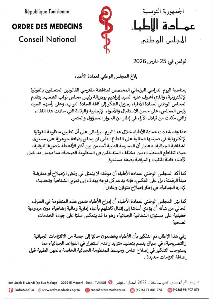 كما بيّن المجلس الوطني لعمادة الأطباء أن إدراج الأطباء ضمن هذه المنظومة في الظرف الحالي من شأنه أن يؤدي أساسًا إلى إثقال كاهلهم بأعباء إدارية ومالية إضافية، دون مردودية حقيقية على مستوى الشفافية الجبائية، وهو ما قد ينعكس سلبًا على جودة الخدمات الصحية.