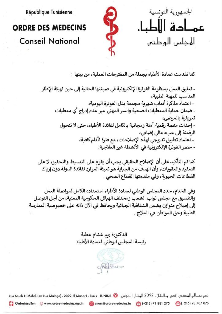 • تعليق العمل بمنظومة الفوترة الإلكترونية في صيغتها الحالية إلى حين تهيئة الإطار المناسب للمهنة الطبية،