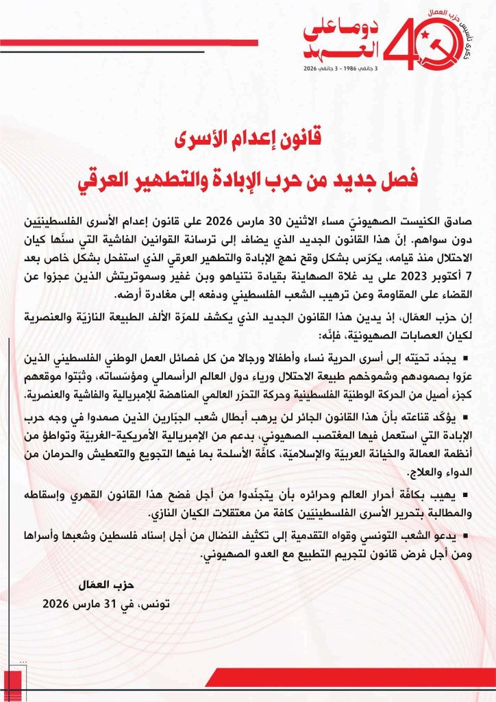 صادق الكنيست الصهيونيّ مساء الاثنين 30 مارس 2026 على قانون إعدام الأسرى الفلسطينيّين دون سواهم. إنّ هذا القانون الجديد الذي يضاف إلى ترسانة القوانين الفاشية التي سنّها كيان الاحتلال منذ قيامه، يكرّس بشكل وقح نهج الإبادة والتطهير العرقي الذي استفحل بشكل خاص بعد 7 أكتوبر 2023 على يد غلاة الصهاينة بقيادة نتنياهو وبن غفير وسموتريتش الذين عجزوا عن القضاء على المقاومة وعن ترهيب الشعب الفلسطيني ودفعه إلى مغادرة أرضه.
