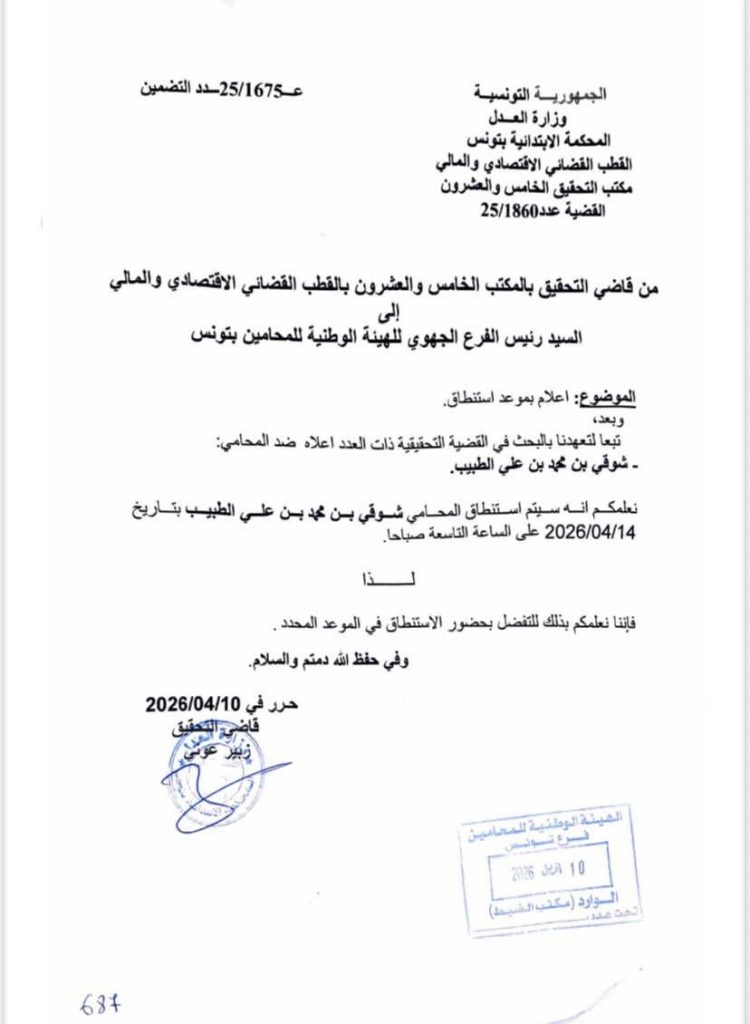 “تلقيتُ بعد ظهر اليوم 10 أفريل 2026 استدعاءً جديدًا للمثول يوم الثلاثاء 14 أفريل الجاري أمام أحد قضاة التحقيق، وذلك في إطار ملف جديد يحمل رقم 5 ضمن سلسلة من الملفات التحقيقية التي فُتحت ضدي، فضلًا عن عشرات الشكايات التي انهالت عليّ منذ إقالتي من رئاسة الهيئة الوطنية لمكافحة الفساد في أوت 2020.