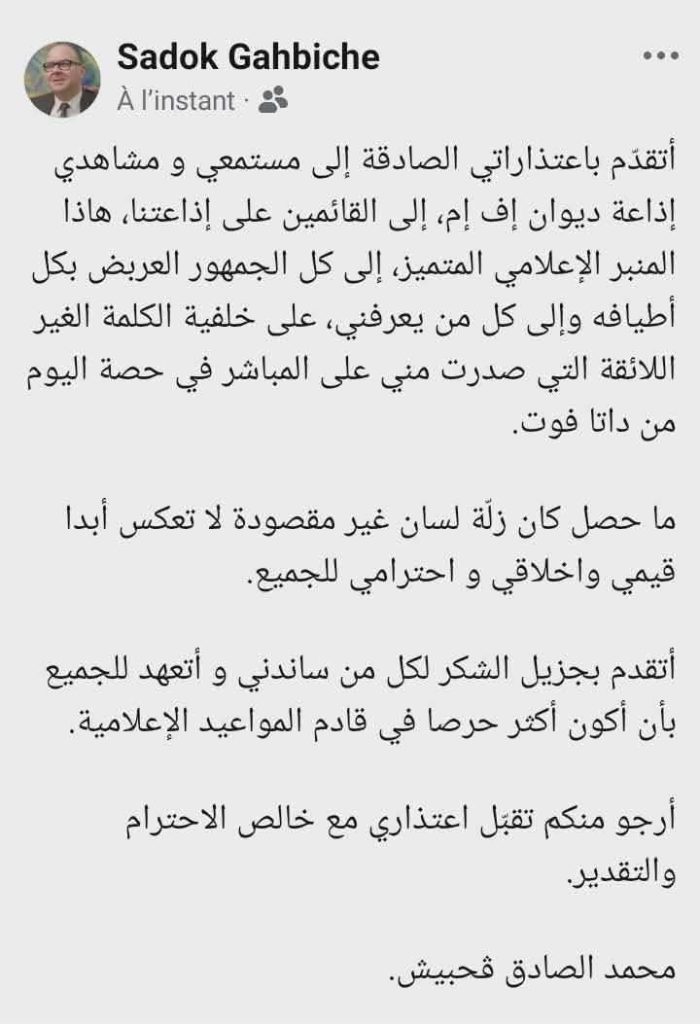 موجة من الانتقادات على صفحات التواصل الإجتماعي بعد تداول روادها كلمة نابية تلفظ بها على المباشر في حصة اليوم الجمعة “داتا فوت” على الديوان اف ام، المحلل الرياضي و الد. الصادق قحبيش…