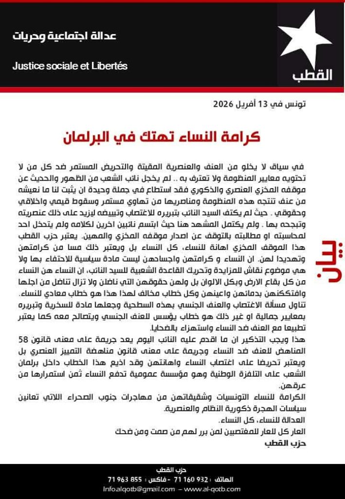 ولم يكتمل المشهد هنا حيث ابتسم نائبين اخرين لكلامه ولم يتدخل احد لمحاسبته او مطالبته بالتوقف عن اصدار موقفه المخزي والمهين. يعتبر حزب القطب هذا الموقف المخزي اهانة للنساء، كل النساء بل ويعتبر ذلك مسا من كرامتهن وتهديدا لهن. ان النساء و كرامتهن واجسادهن ليست مادة سياسية للاحتفاء بها ولا هي موضوع نقاش للمزايدة وتحريك القاعدة الشعبية للسيد النائب، ان النساء هن النساء من كل بقاع الارض وبكل الالوان بل ولهن حقوقهن التي ناضلن ولا تزال تناضل من اجلها وافتككنهن بدمائهن واعينهن وكل خطاب مخالف لهذا هذا هو خطاب معادي للنساء. تناول مسألة الاغتصاب والعنف الجنسي بهذه السطحية وجعلها مادة للسخرية وتبريره بمعايير جمالية او غير ذلك هو خطاب يؤسس للعنف الجنسي ويتصالح معه كما يعتبر تطبيعا مع العنف ضد النساء واستهزاء بالضحايا.