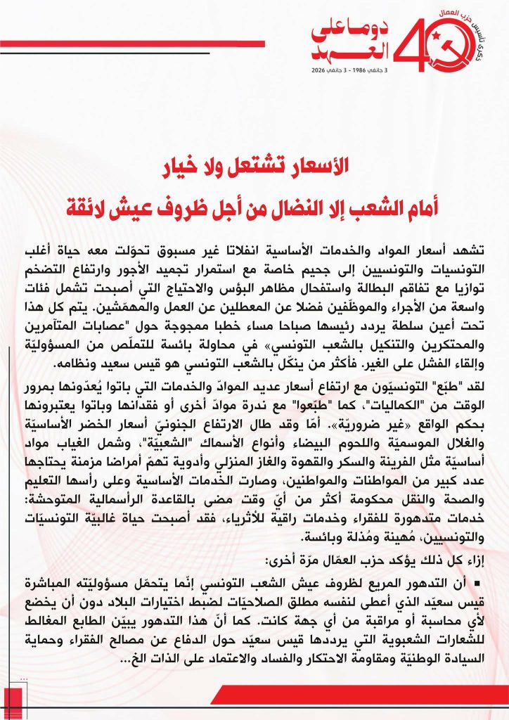 “تشهد أسعار المواد والخدمات الأساسية انفلاتا غير مسبوق تحوّلت معه حياة أغلب التونسيات والتونسيين إلى جحيم خاصة مع استمرار تجميد الأجور وارتفاع التضخم توازيا مع تفاقم البطالة واستفحال مظاهر البؤس والاحتياج التي أصبحت تشمل فئات واسعة من الأجراء والموظّفين فضلا عن المعطلين عن العمل والمهمّشين. يتم كل هذا تحت أعين سلطة يردد رئيسها صباحا مساء خطبا ممجوجة حول “عصابات المتآمرين والمحتكرين والتنكيل بالشعب التونسي» في محاولة بائسة للتملّص من المسؤوليّة وإلقاء الفشل على الغير. فأكثر من ينكّل بالشعب التونسي هو قيس سعيد ونظامه.