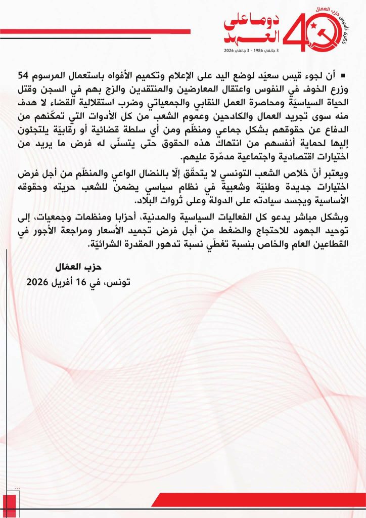 - أن لجوء قيس سعيّد لوضع اليد على الإعلام وتكميم الأفواه باستعمال المرسوم 54 وزرع الخوف في النفوس واعتقال المعارضين والمنتقدين والزج بهم في السجن وقتل الحياة السياسيّة ومحاصرة العمل النقابي والجمعياتي وضرب استقلالية القضاء لا هدف منه سوى تجريد العمال والكادحين وعموم الشعب من كل الأدوات التي تمكّنهم من الدفاع عن حقوقهم بشكل جماعي ومنظّم ومن أي سلطة قضائية أو رقابيّة يلتجئون إليها لحماية أنفسهم من انتهاك هذه الحقوق حتى يتسنّى له فرض ما يريد من اختيارات اقتصادية واجتماعية مدمّرة عليهم.