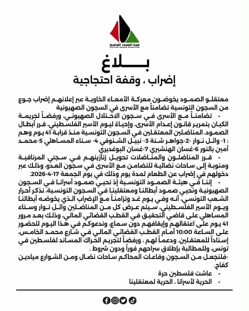 • قرر المناضلون والمناضلات تحويل زنازينهم في سجني المرناقية ومنوبة إلى ساحات نضالية للتضامن مع الأسرى في سجون العدو، وذلك عبر دخولهم في إضراب عن الطعام لمدة يوم وذلك في يوم الجمعة 17-4-2026.
