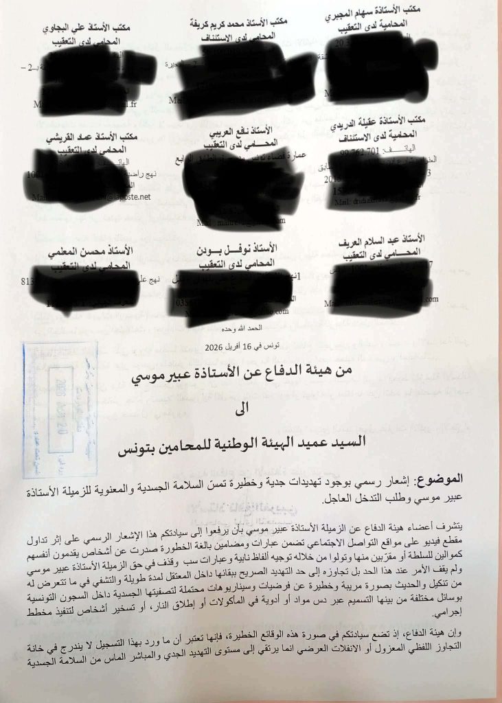 “قامت هيئة الدفاع اليوم بايداع اشعار رسمي نعلم فيه السيد العميد بالتهديدات بالتصفية الجسدية التي طالت الاستاذة عبير موسي عبر منصات التواصل الاجتماعي !
