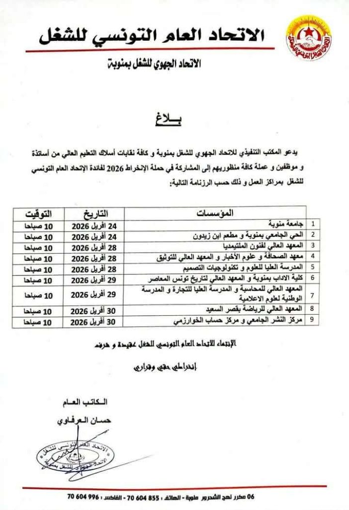 بالتنسيق مع الاتحاد الجهوي للشغل بمنوبة، والفرع الجامعي لأساتذة التعليم العالي بالجهة تدعو الجامعة العامة للتعليم العالي كافة الزميلات والزملاء إلى المشاركة الفاعلة لإنجاح حملة الانخراط والانتساب التي تنظم بمؤسسات التعليم العالي بمنوبة حسب الجدول المصاحب.