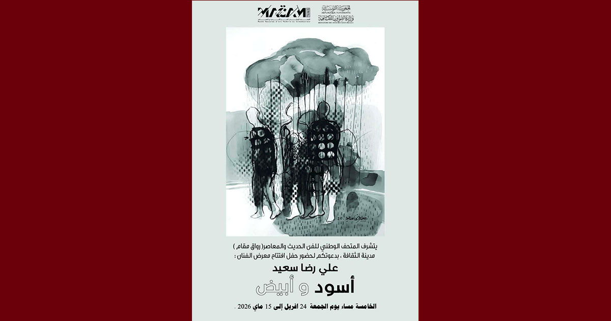 مقام: “يسرنا دعوة الأصدقاء والمهتمين بالفن والجمال لحضور حفل افتتاح المعرض الشخصي “أسود وأبيض” للفنان علي رضا سعيد الذي يستضيفه – رواق المتحف الوطني للفن الحديث والمعاصر(مقام) بمدينة الثقافية الشاذلي القليبي – تونس ، وذلك يوم الجمعة 24 أفريل 2026 على الساعة الخامسة مساءً، ليتواصل إلى غاية 15 ماي 2026. يضم المعرض أكثر من خمسين عملا بالحبر الأسود على الورق، تتداخل فيها الحكايات وتتقاطع فيها الظلال والضوء لتشكل سردا بصريا عن الإنسان في ضعفه وقوته وانتظاره .