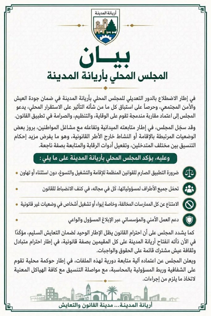 كما يشدد المجلس على أن احترام القانون يظل الإطار الوحيد لضمان التعايش السليم، مؤكدًا في الآن ذاته انفتاح أريانة المدينة على كل المقيمين بصفة قانونية، في إطار احترام متبادل وثقافة عيش مشترك قائمة على الحقوق والواجبات.