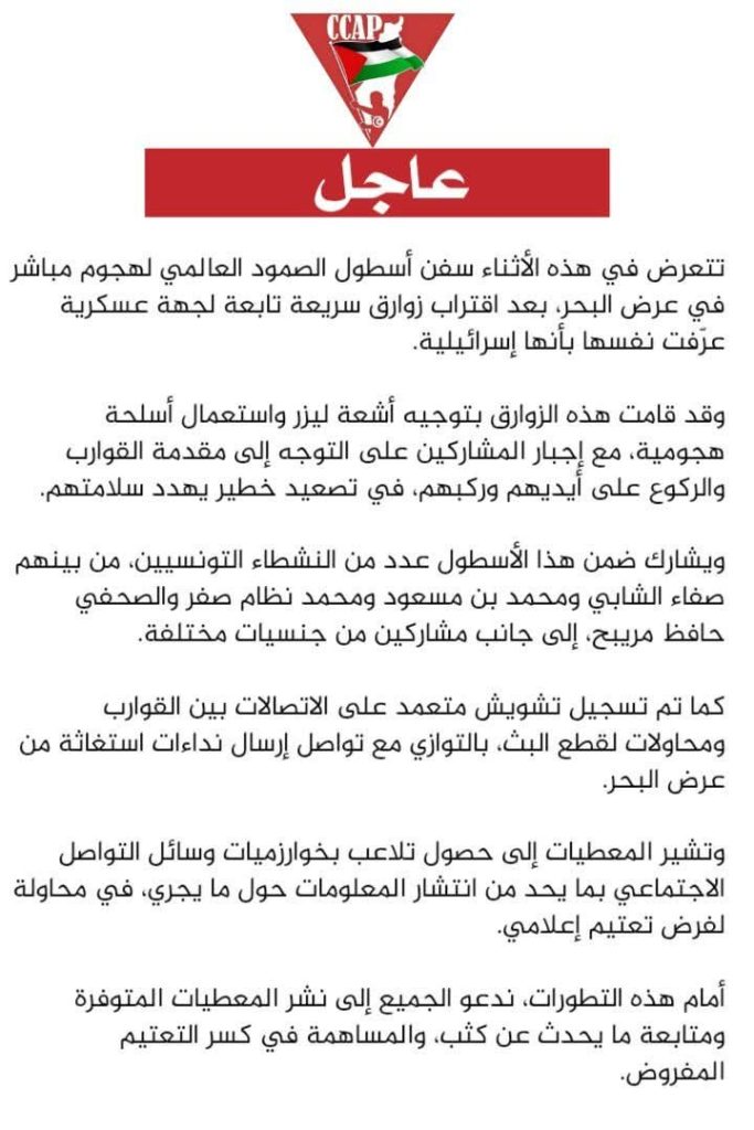 كما تم تسجيل تشويش متعمد على الاتصالات بين القوارب ومحاولات لقطع البث، بالتوازي مع تواصل إرسال نداءات استغاثة من عرض البحر.