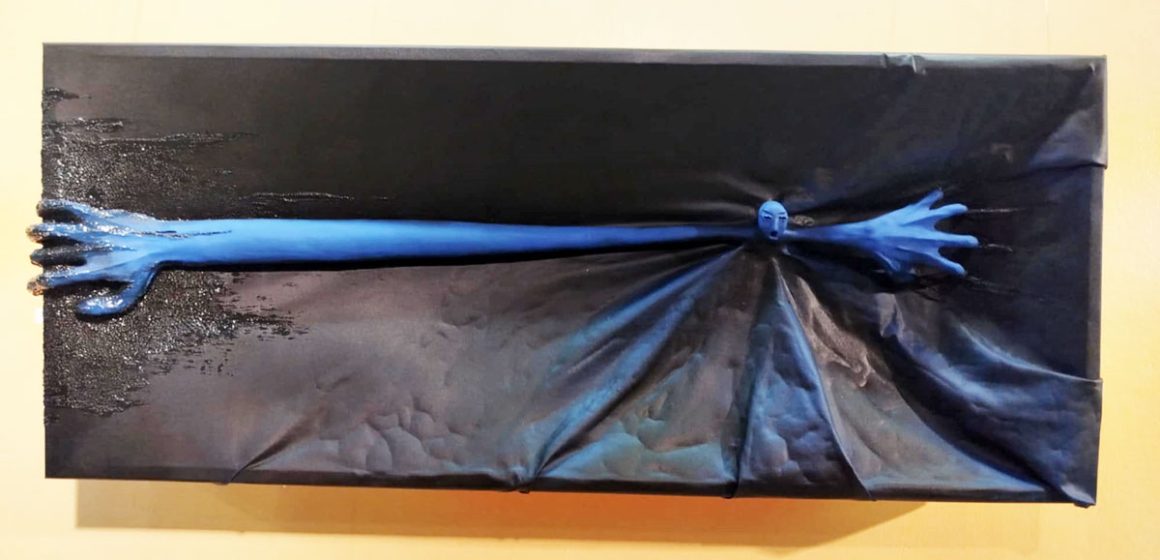 Ce que propose Salma Mbarek avec son œuvre exposée depuis le 27 mai et jusqu’au 9 juin 2025, dans le cadre de l’exposition collective « Narration immersive », à la galerie Aire Libre à l’espace El Teatro, à Tunis, ce n’est pas un simple tableau, c’est un corps figé sous tension. Une scène primitive. Sur une toile noire, une forme humanoïde bleue, doigts crispés, semble jaillir, ou plutôt se débattre, s’agripper désespérément à la surface de l’existence. Le bras tendu, les doigts trempés de paillettes bleues, tentent d’émerger, comme si le corps voulait s’extraire d’un enfermement invisible, mais insupportable.