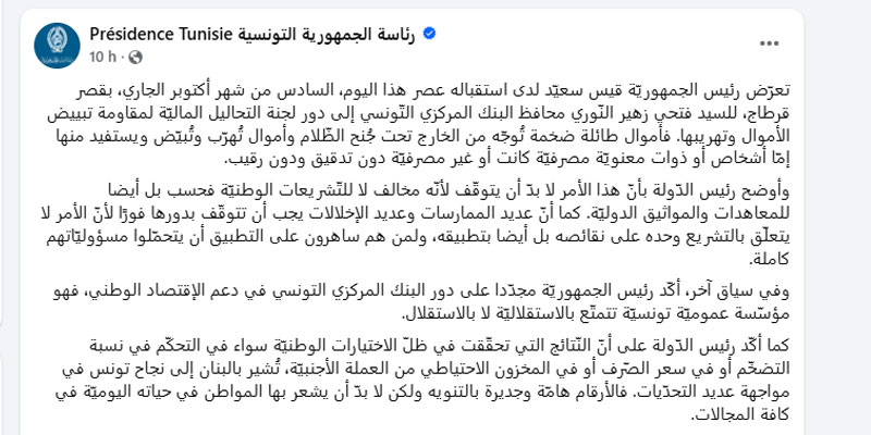 Le président Kaïs Saïed n’est clairement pas satisfait du travail la Commission tunisienne des analyses financières (Ctaf) et il ne cesse de le faire savoir à chacune de ses rencontres avec le gouverneur de la Banque centrale de Tunisie (BCT), Fethi Zouhair Nouri. Au cours de leur dernière rencontre, qui a eu lieu lundi 6 octobre 2025 au Palais de Carthage, le chef de l’Etat a posé, une nouvelle fois, le problème de la lutte contre le blanchiment d’argent et les flux financiers illicites de et vers la Tunisie. En appelant à ce que ces pratiques cessent définitivement, laissant ainsi entendre qu’elles se poursuivent impunément.