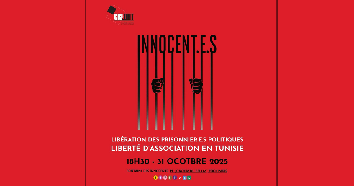 Dénonçant une escalade de la répression en Tunisie, le Comité pour le Respect des Libertés et des Droits de l’Homme (CRLDHT) appelle à un rassemblement de solidarité qui sera organisé à Paris ce vendredi 31 octobre 2025.