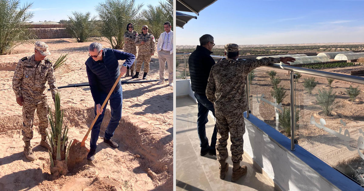 L’ambassadeur d’Italie en Tunisie, Alessandro Prunas, et la directrice de l’Agence italienne pour la coopération au développement (AICS) à Tunis, Isabella Lucaferri, ont visité, le 24 novembre 2024, les projets de coopération italienne à Rjim Maatoug et El Mahdeth, dans le gouvernorat de Kebili. (Photos : Alessandro Punas plantant un palmier et inspectant l’évolution du projet El Mahdeth).