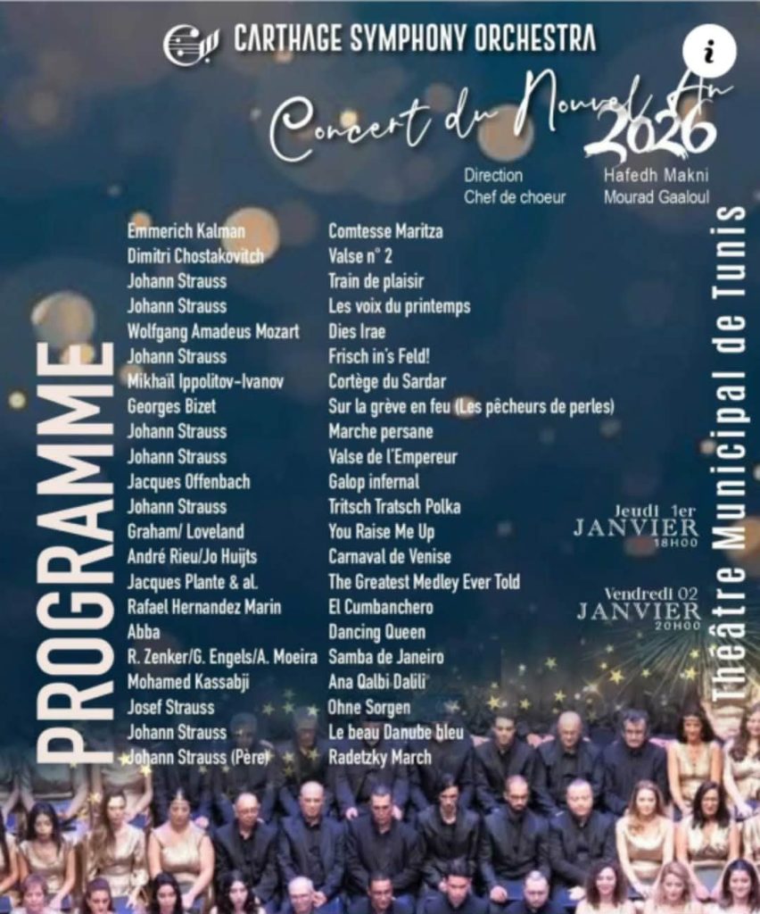 Le programme du concert du Nouvel An du Carthage symphony orchestra prévu les 1er & 2 janvier 2026 au Théâtre municipal de Tunis a été dévoilé.