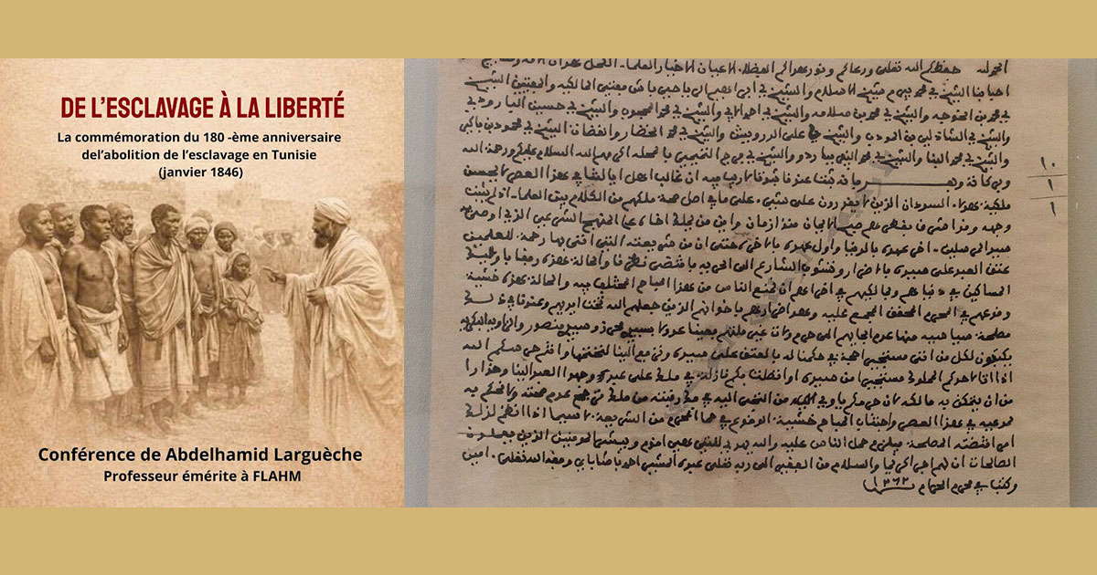 A l’occasion de la commémoration du 180e anniversaire de l’abolition de l’esclavage en Tunisie, le 23 janvier 1846, par Ahmed Ier Bey, Pr. Abdelhamid Largueche, professeur émérite d’histoire et ancien membre du Comité du Patrimoine Mondial à l’Unesco, donnera une conférence sur ce sujet intitulée «De l’esclavage à la liberté». (Ph. Manuscrit du décret d’abolition de l’esclavage).