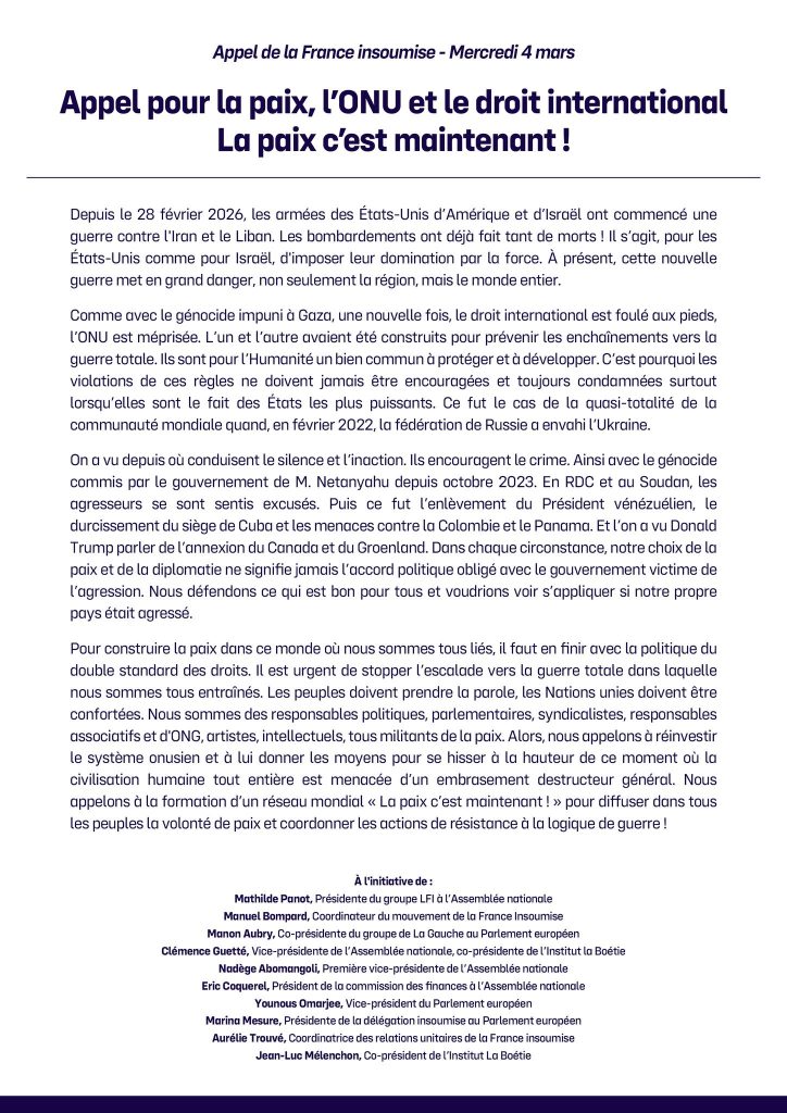 Dans un appel lancé le 4 mars 2026 sur son site web et que nous reproduisons ci-dessous, le parti La France Insoumise appelle à la formation d’un réseau mondial «La paix c’est maintenant !» pour diffuser dans tous les peuples la volonté de paix et coordonner les actions de résistance à la logique de guerre ! L’appel a été lancé à l’initiative de dix dirigeants de LFI, dont son président Jean-Luc Mélenchon.