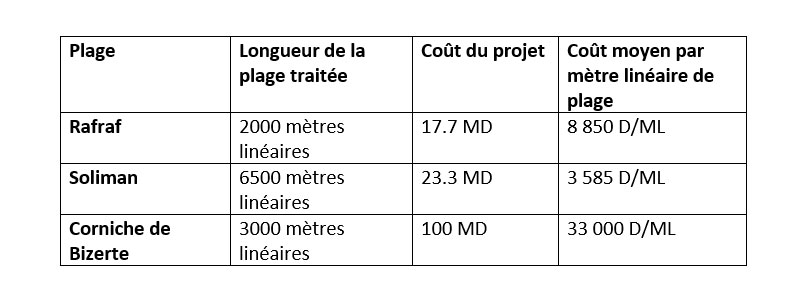 Il apparaît clairement que la protection d’un mètre linéaire de plage à Bizerte coûte 3,7 fois plus cher celle de Rafraf et 9,2 fois plus cher que celle de Soliman.