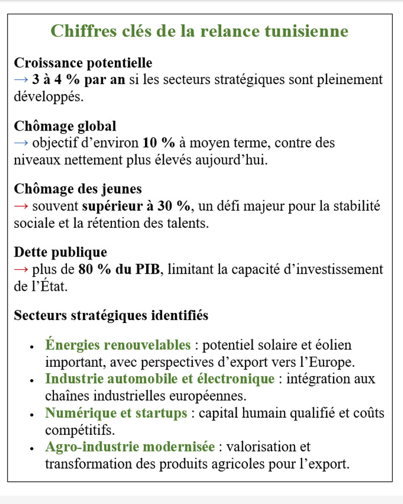 Si ces quatre secteurs sont développés de manière cohérente et planifiée, le pays pourrait soutenir une croissance annuelle de 3 à 4 %, ramener le chômage global à environ 10 % et créer des emplois répartis entre le littoral et l’intérieur, donnant enfin vie au potentiel longtemps contenu de la Tunisie.
