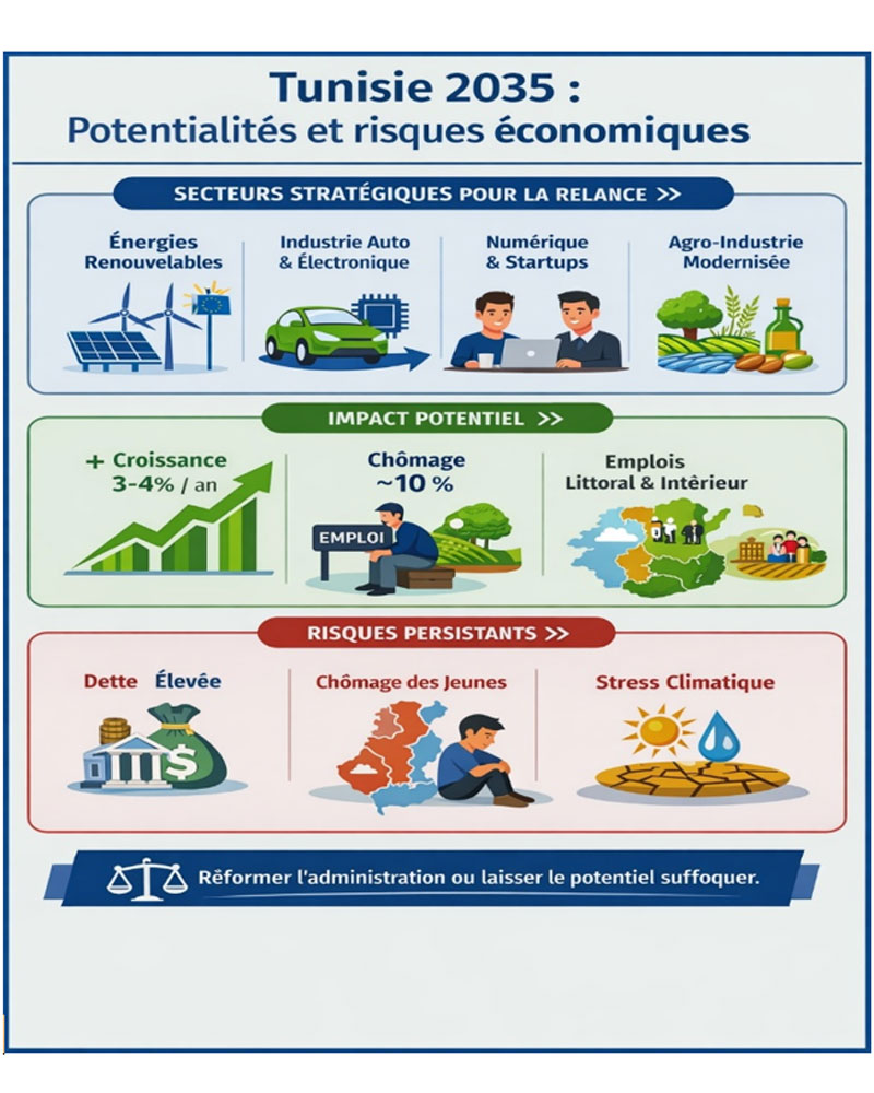 Plusieurs secteurs – énergies renouvelables, industrie technologique, numérique et agro-industrie – pourraient soutenir une croissance annuelle de 3 à 4 % en Tunisie d’ici 2035. Mais cette trajectoire reste conditionnée par des réformes structurelles, notamment la modernisation de l’administration et la gestion des défis économiques et climatiques.