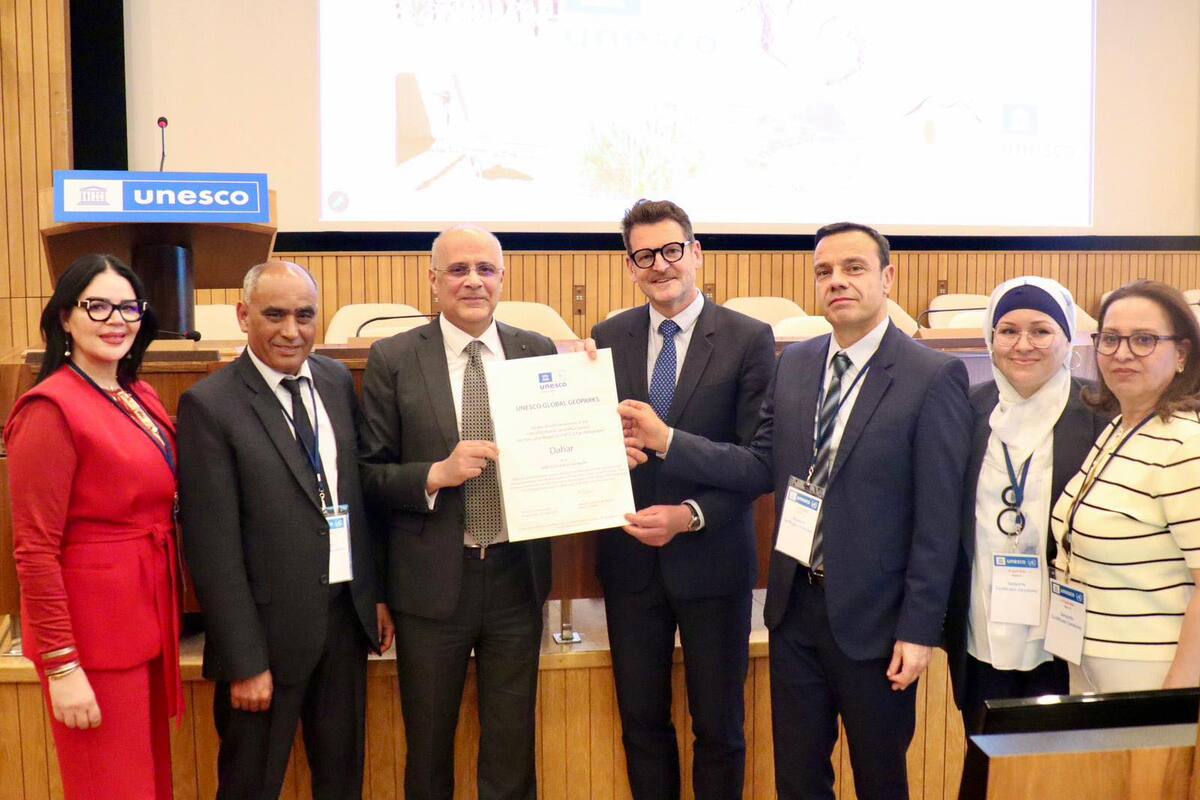 M. Dhia Khaled, ambassadeur, Délégué Permanent, de la Tunisie auprès de l’Unesco, a reçu, le 27 avril 2026, le certificat officiel d’inscription du Géoparc «Dahar » .