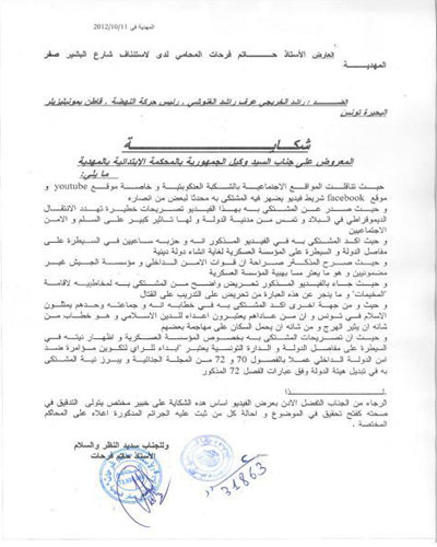 Me Hatem Farhat a déposé aujourd’hui une plainte contre Rached Khérji alias Ghannouchi auprès du procureur de la république au tribunal de première instance de Mahdia.