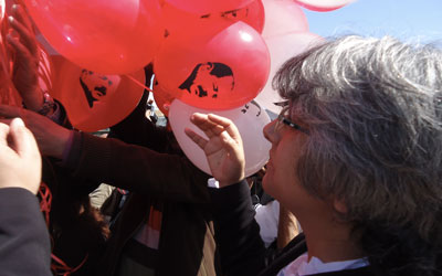 Puis à 11h40, la veuve de Chokri Belaid a ouvert le filet des ballons pour un lâcher de toute beauté dans un ciel bleu azur (même le vent avait retenu son souffle!!). Elle avait au préalable distribué quelques ballons aux enfants très fiers d'avoir entre les mains le symbole d'une résistance qui, espérons-le, triomphera de tous les obscurantismes rampants!